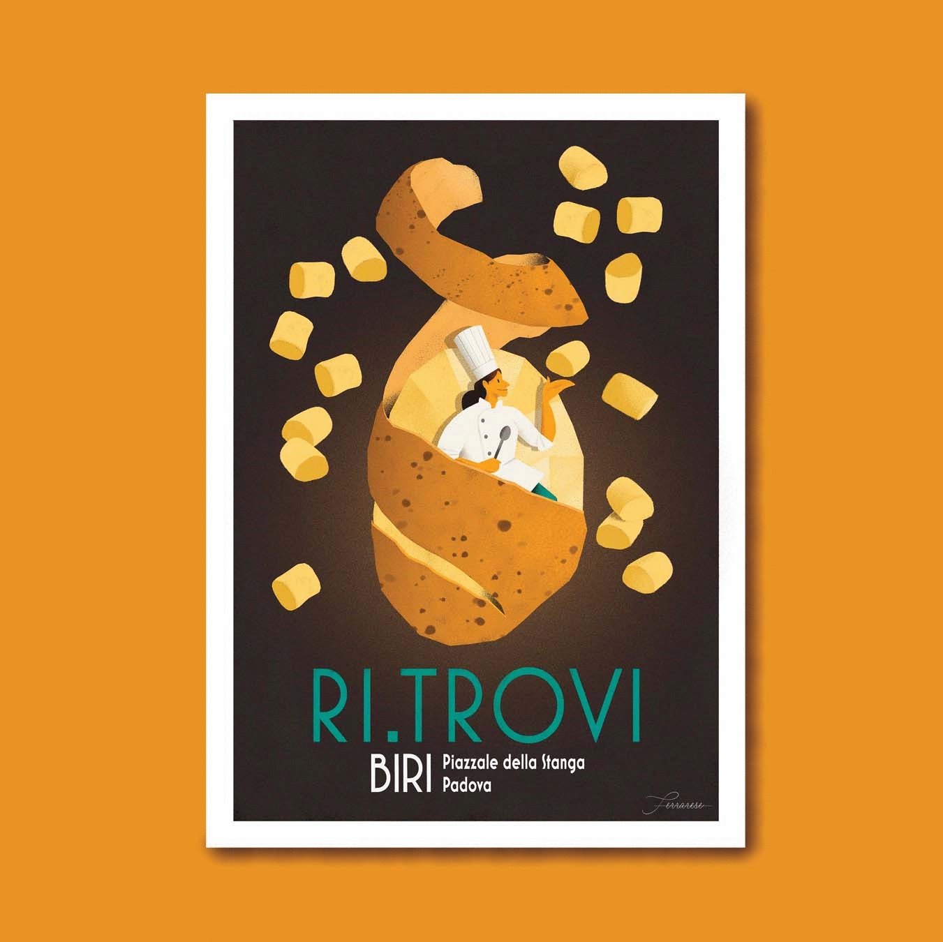 A series of illustrated posters for the RiTrovi restaurant inside the historic West Bestern Hotel Biri in Padua.